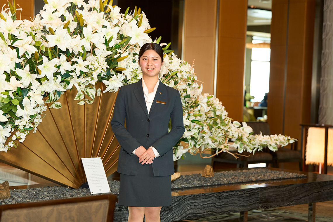 私は現在、マンダリン オリエンタル 東京でコンシェルジュを務めています。お客様からのご依頼は、レストランや新幹線の手配、誕生日やプロポーズの演出サポート、時には空港まで忘れ物を取りに行くこともあり、本当に多岐にわたります。高校生の頃から英語が好きで、「英語を使って人を笑顔にできる仕事がしたい」と考え、サービス業の中でも最も水準が高いと感じたホテル業界を志しました。ラグジュアリーホテルの中でもマンダリン オリエンタル 東京は、スタッフ一人ひとりの英語のレベルが非常に高く、「できて当たり前」とされる環境です。当初はその厳しさに不安もありましたが、「自分を成長させるためには高いハードルに挑戦すべきだ」と考え、あえてこの道を選びました。実際に働くなかで強く感じるのは、お客様の反応がそのまま自分の励みになるということです。ご案内したレストランを喜んでいただいたり、名前を覚えて声をかけていただいたときには、「この道を選んで良かった」と心から思えます。日々の緊張感ある環境の中で一つひとつのご依頼に応えることは簡単ではありませんが、その積み重ねが自分のサービスを磨き続けてくれると感じています。