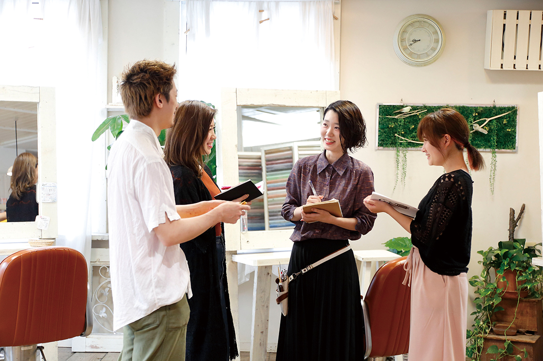 在学中に大手サロンでのインターンシップでアシスタント業務を経験していたので、就職後は現場での動き方に迷うこともなく、すぐに先輩方の仕事を手伝うことができました。また1カ月間海外研修に行った際、積極性とコミュニケーション能力を高めることができ、職場でのチームワークや接客力につながっています。入社5年目には店長に抜擢され、スタッフの育成に携わることに!この時は、プロ専科の授業で後輩の技術指導をしたことが役立ちました。6年目からはディレクターも兼任することになり、店舗のブランディングや広報に力を入れています。店全体の売り上げ動向を意識しながら、集客やリピートにつながるアイデアを常に考えています。今後も店の経営拡大を念頭に、スタッフみんなが働きやすい環境をつくっていきたいです。
