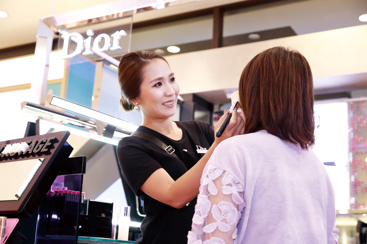 在学中はE-コレでメイクショーをしたり、クラスメイトと行事で盛り上がったりと、楽しい思い出が沢山あります。卒業して約7年が経った今でも、当時の友だちとはずっと仲良しです。現在は、接客販売や後輩の指導に加え、目標としていたコーナーマネージャーとして東京での会議や企画説明会などにも参加。コーナー全体の成長を目指し、日々奮闘中です。この仕事の醍醐味は、気持ちがふさいでいる時でもお客様のご来店で元気を取り戻せたり、メイクを通してお客様に笑顔になっていただけたりすること。また、3年連続で社内のメイクコンテストへ出場できたことに加え、昨年はタッチアップ率(※)を競うコンテストで私が働く店舗が1位になれたことなど、結果が目に見える嬉しさもあります。これからもますます店舗が活気づくよう頑張ります。