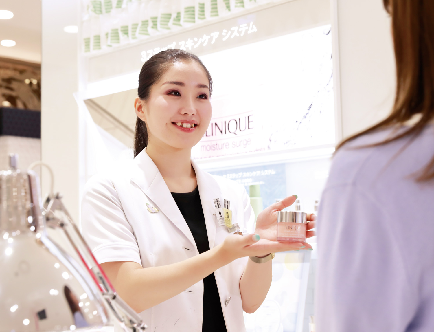 私が抱えていた肌の悩みを解消してくれたのがクリニークの化粧品!それ以後、このブランドが大好きになり、働いてみたいとECCアーティスト美容へ入学。在学中は、肌の専門知識やメイクの技術を得られただけでなく、ものの考え方や言葉遣いなども大きく変わり、志望通りの就職もかなえられました。授業で肌の悩みに合わせた接客ロールプレイングを何度も練習したことを、現場でのカウンセリングに活かし、話すことが苦手な方にもお気持ちに寄り添って丁寧に接客しています。相手に合わせてコミュニケーションをとることは難しい半面、面白さもあり、お客様が「次も指名します」とおっしゃってくださると本当に嬉しいです。まだ新人なので、今は膨大な商品知識を身に付け、日々の仕事を覚えることで精一杯ですが、早く一人前になれるよう頑張っています。