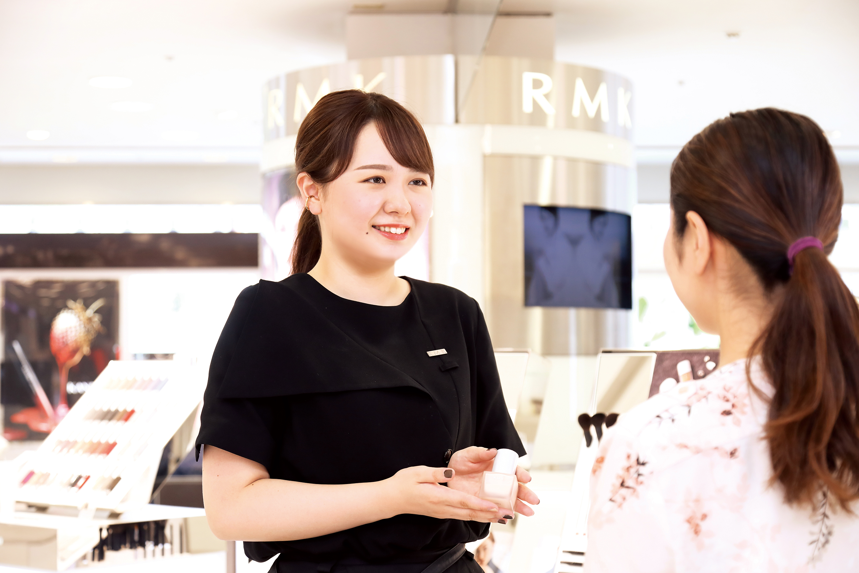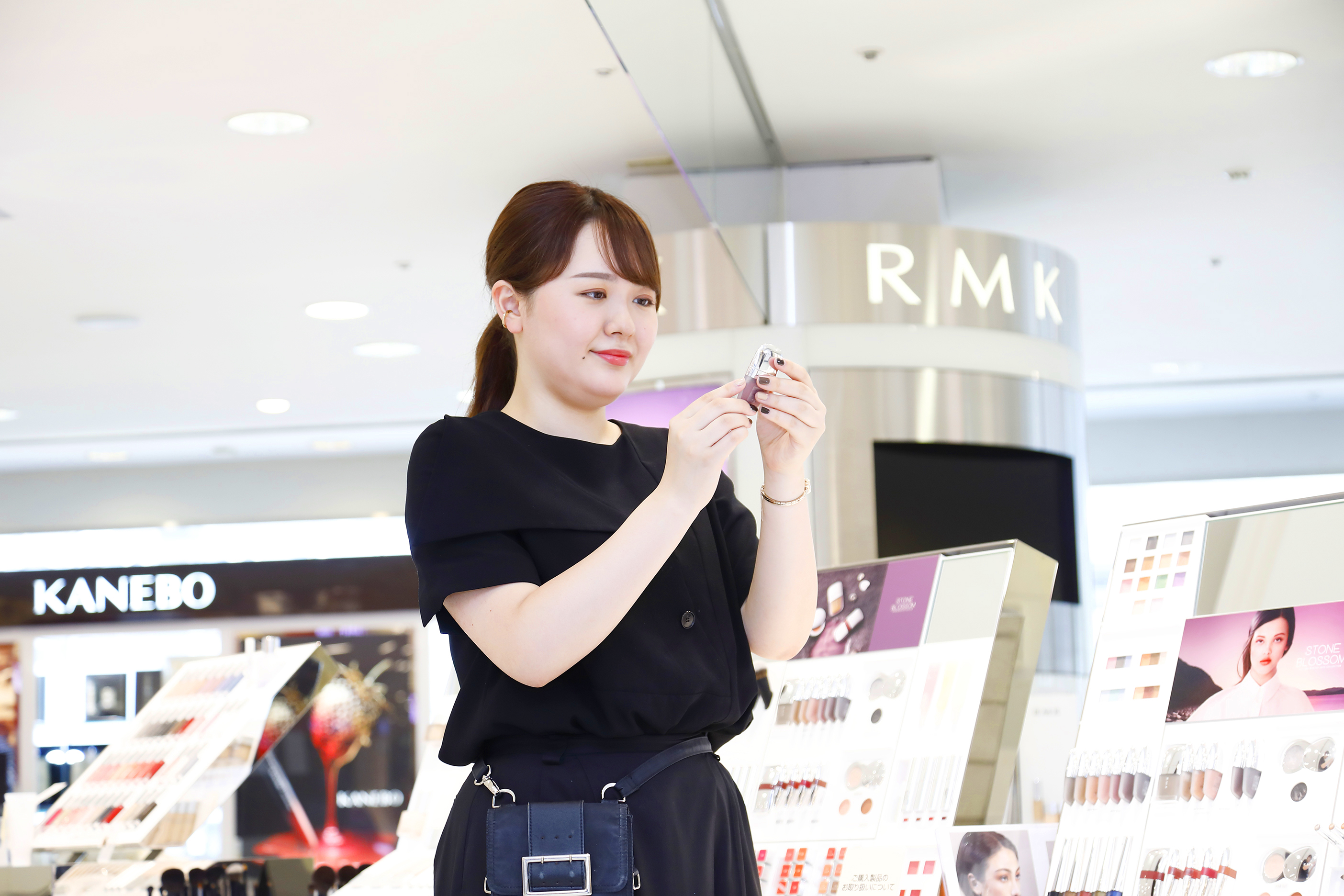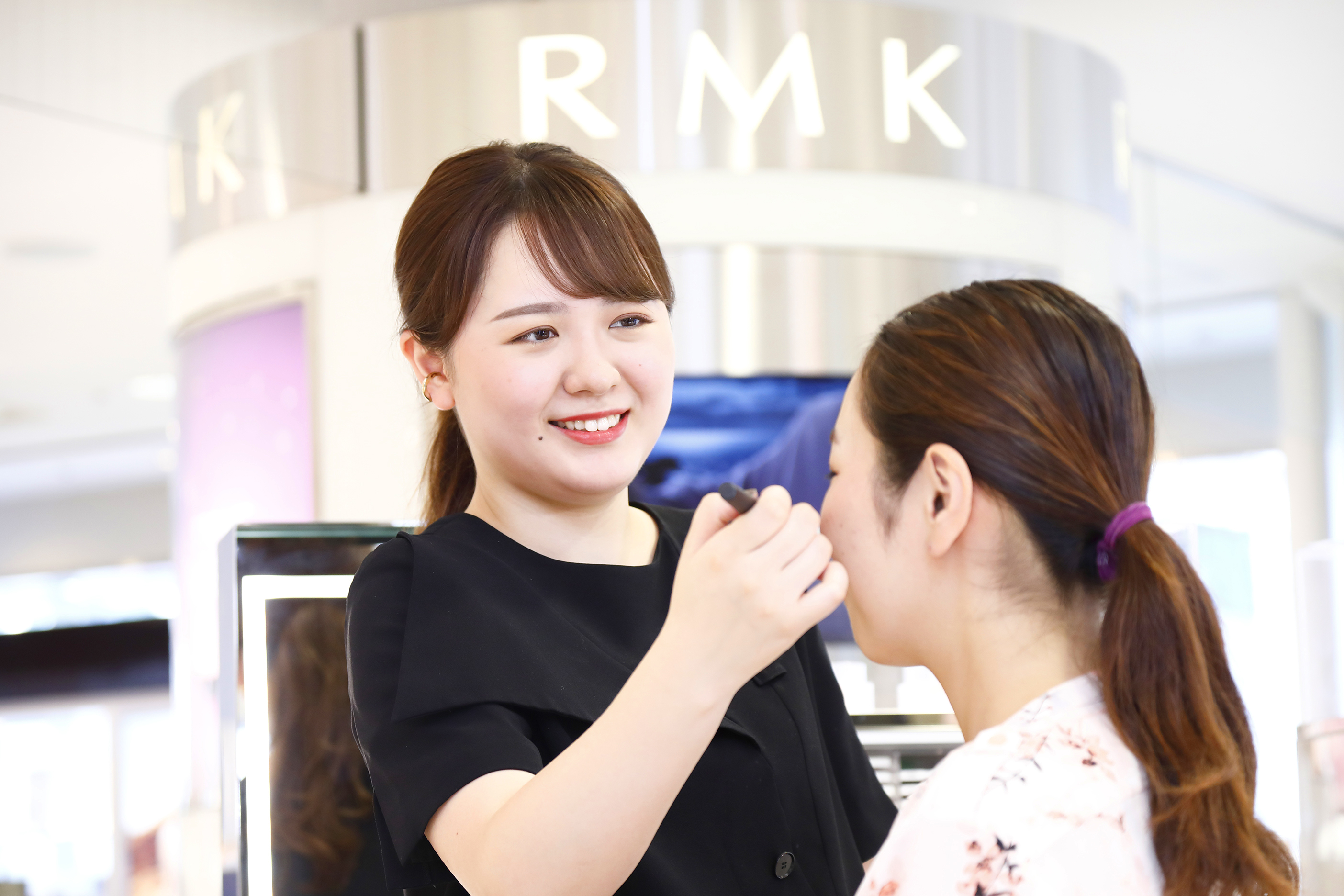 RMKを志望したきっかけは、在学中に受けたブランドセミナー。RMKのアーティストの方からメイクの技術を指導していただけたほか、洗練された話し方や立ち居振る舞いに憧れが高まりました。また、在学中の学びの中で印象的だったのが、接客のロールプレイング。お客様一人ひとりの悩みに応じた接客力を習得できました。この力を発揮し、初めてメイクをされる方には下地やファンデーション、なりたい雰囲気に合わせたメイクの色をおすすめしたり、成人式のメイクのご相談では振袖の色などを参考にアドバイスをしたり。丁寧にメイクの方法をお伝えしています。美容業界は次々に新商品が発売され、常に新しいメイクに触れることができます。そのため、私自身も新鮮な気持ちで仕事に携わることができます。