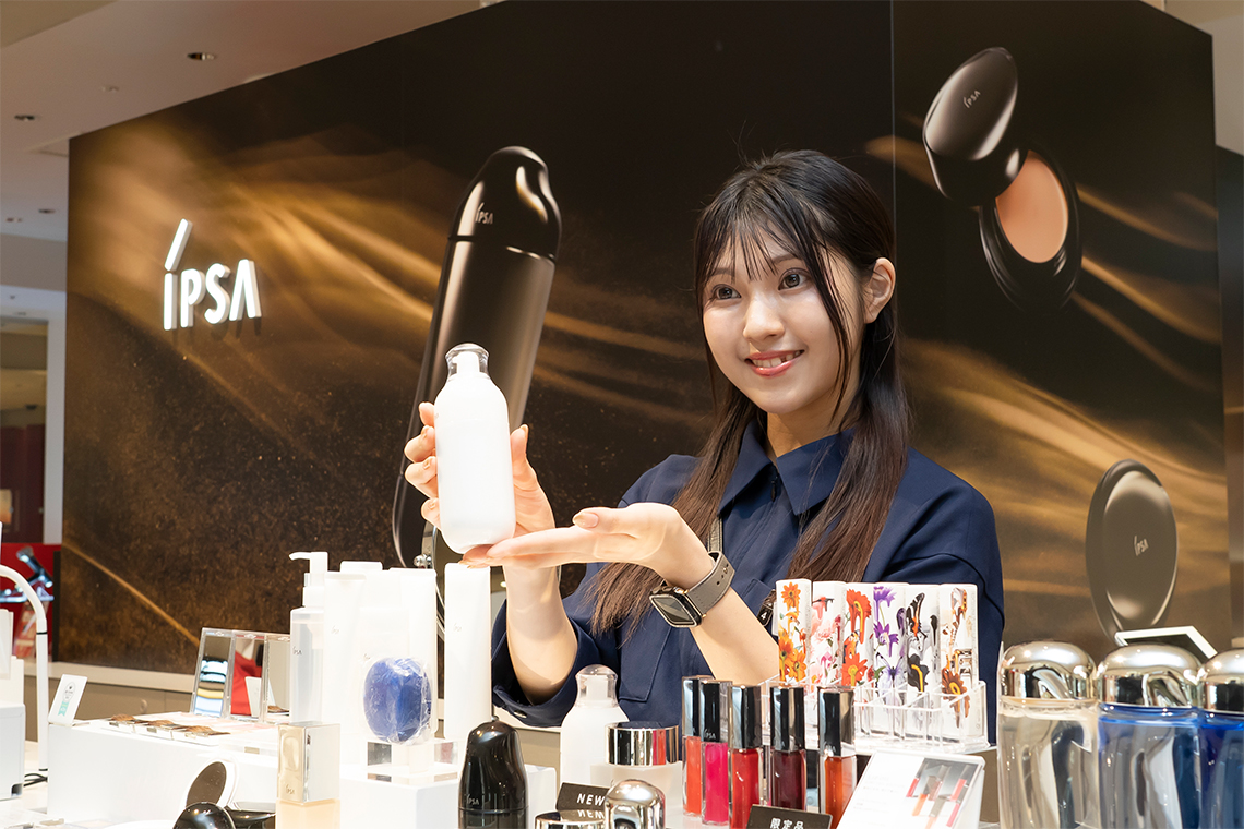 イプサは一人ひとりの素肌の美しさを引き出すことを大事にしているブランド。まずはお客さまの肌質、生活環境、お悩みを知るために、お肌の測定で素肌の状態や伸びしろを知っていただきます。お客さまが愛用されているブランドの特徴を理解していると、お悩みやなりたいイメージが想像しやすいので、学生時代に学んだブランド研究の授業が役立っています。
