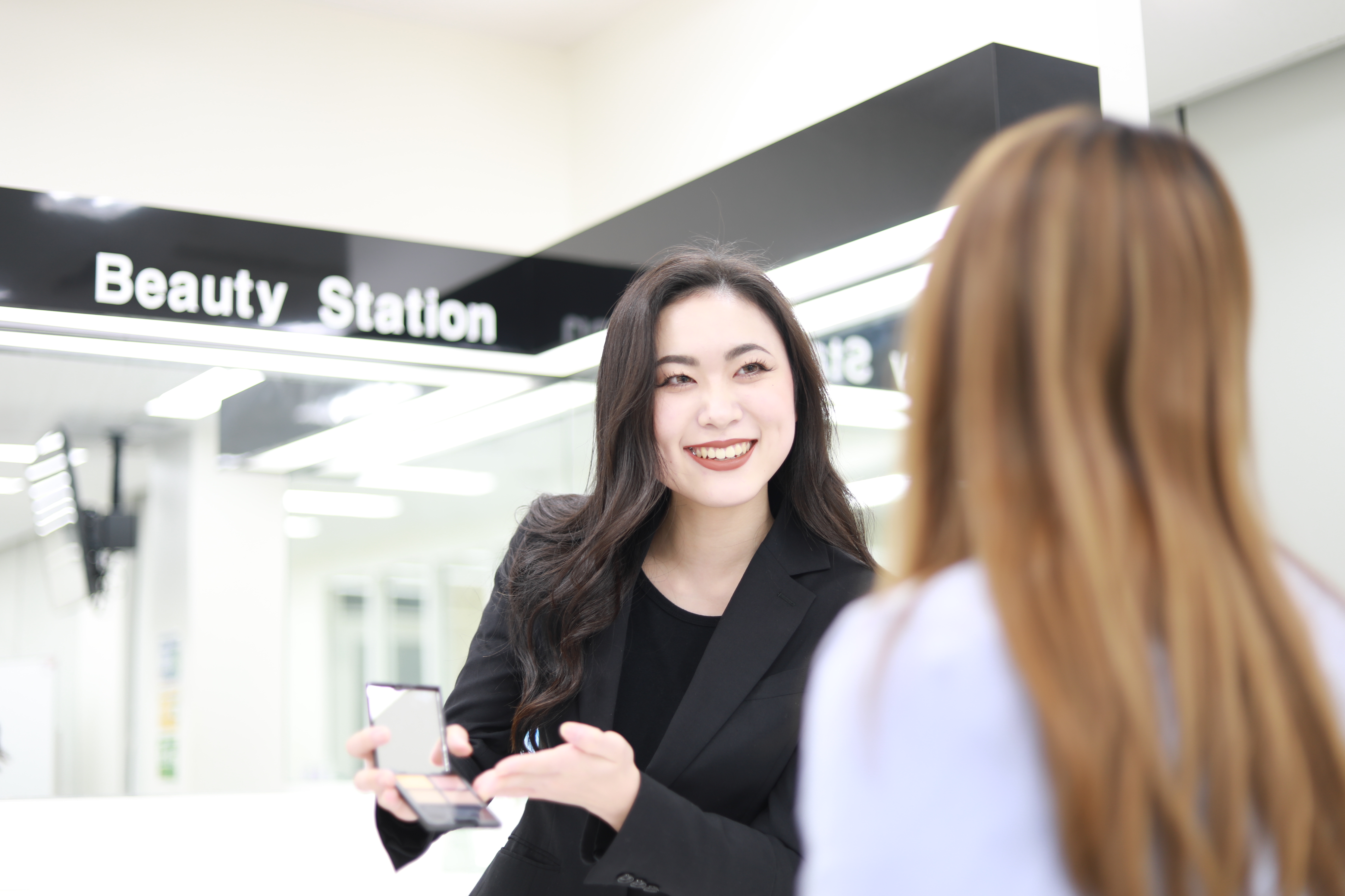 ビューティアドバイザーコースでの学びは、ビューティアドバイザーの仕事に直結する内容ばかり。実際に百貨店でのインターンシップに参加するようになって、そのことをより実感しています。店頭での接客方法をロールプレイングで学ぶ「コスメティックセールススキルズ」という授業では、美容部員の経験のある先生から、お客さまのライフスタイルをしっかり把握して商品提案をすること・お客さまのお悩みに共感して寄り添うこと…など、具体的なアドバイスをたくさんいただきました。電話対応や入金の仕方まで繰り返し練習していたので、店頭に立ったときも戸惑わずに実践することができ、自信を持って接客することができました。