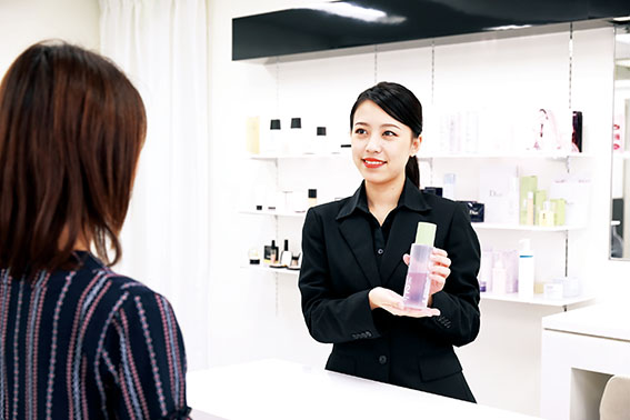 本物さながらのコスメカウンターがあり、ビューティアドバイザーに特化して学べるのが、このコースの魅力。私自身、美意識の高いクラスメイトとともに、美容に関する新しい知識や実践的な学びを得られることに刺激を受けています。メイクでコンプレックスをカバーできた時に感じた嬉しさを原動力に、女性の美を支えるビューティアドバイザーを目指して頑張ります!