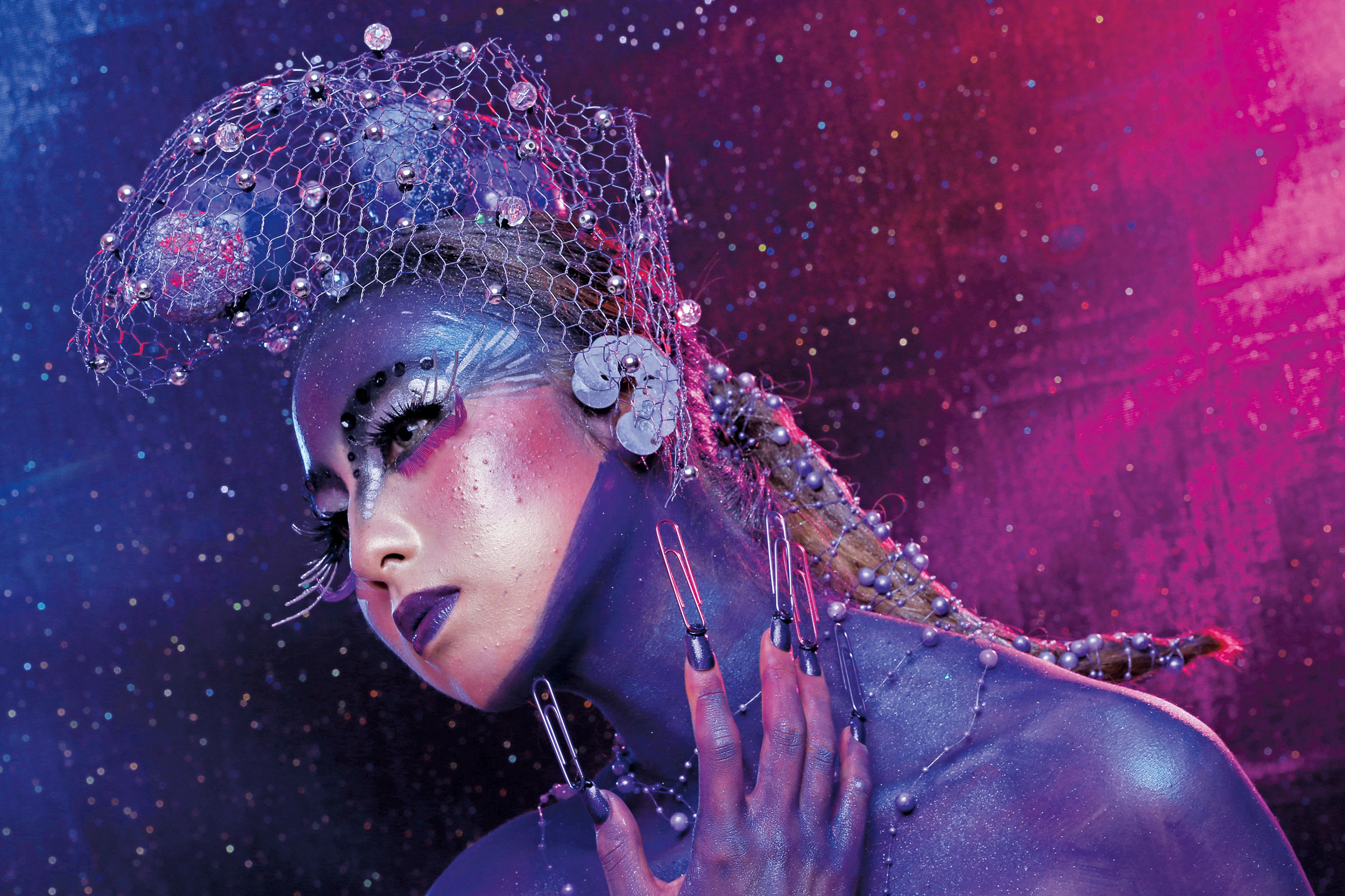 ポイントは、深い紫色で宇宙の果てしなさを表し、ビビッドピンクで神秘的な要素も加えたところ。惑星を想像させる球体や、人間離れした爪やまつげをプラスしてエイリアンに近づけました。何度も先生にダメ出しされましたが、最後は納得のいく作品に仕上がりました。ECCアーティスト美容での経験を活かし、海外でショーや雑誌のヘアメイクのキャリアを積んだ後、日本でグローバルなメイクサロンを開くのが将来の夢です!