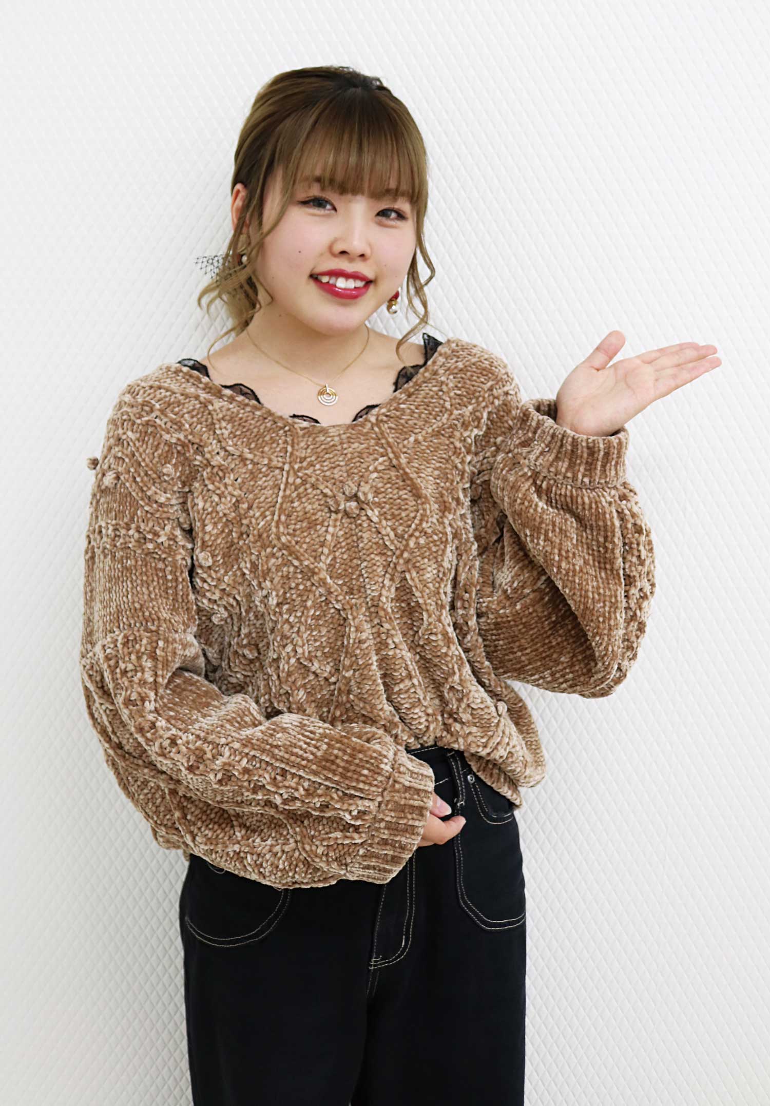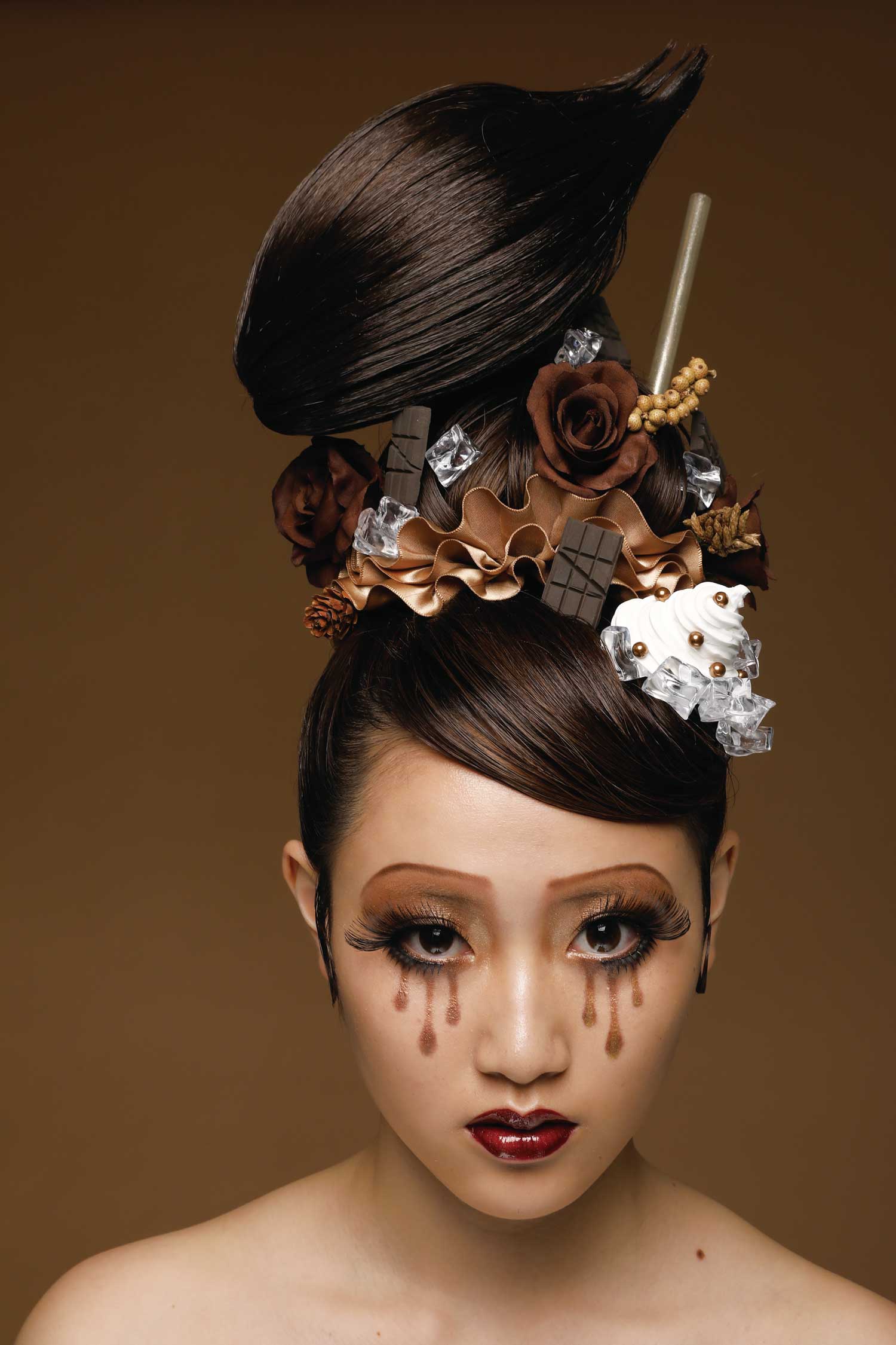 - 頭にカカオをイメージしたウィッグをのせ、氷の質感を出すために、ラメを多く使ったり、チョコレートが溶けたようなメイクに仕上げたのがポイントです。まゆげを左右対称に描くのに苦労しました。将来は美容師兼ヘアメイクアーティストを目指します!