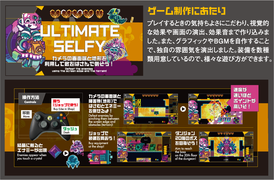 - 日本ゲーム大賞2017年アマチュア部門のお題は「はさむ」。優秀賞・個人賞のW受賞を果たした作品「Ultimate Selfy(アルティメット・セルフィ)」は、「縦横無尽に挟みまくる」をテーマに開発した作品です。その内容は「ダンジョン奥に眠るボスをめざし、立ちはだかる敵を次々と倒していく」というもの。敵をはさんで倒す方法や、主人公の速度を一時的に高めるブース機能、気分を高める視覚的演出など、随所にセンスを感じさせます。