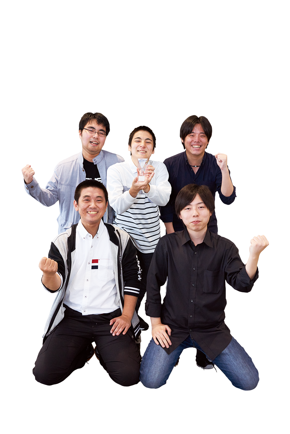 藤原さん(ゲームデザイナー)、松橋さん(ゲームデザイナー)、加村さん(ゲームプログラマ)、加藤さん(ゲームプログラマ)、伊藤さん(ゲームプログラマ)