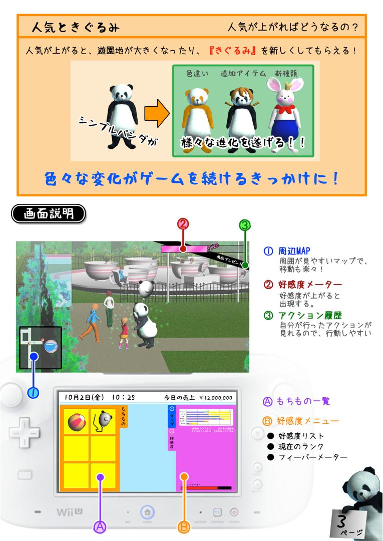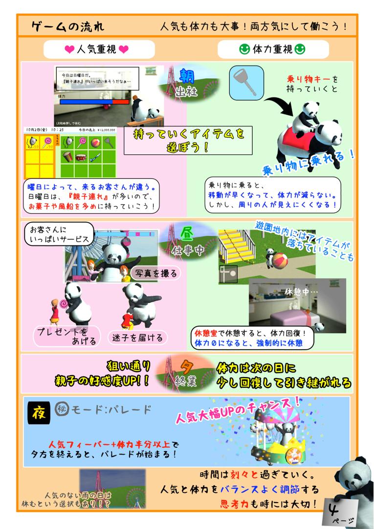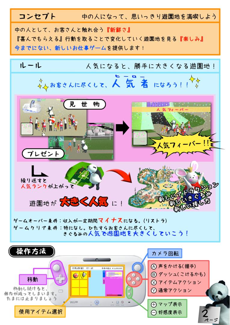 - 私は、この企画書を作るのに、遊園地のモデルを作りました。それは、自分のやる気を上げて楽しんで作業をするためでした。そのおかげで、この企画書は私にとって『新しく』『面白い』ものになりました。第二回の優秀賞はどうしても欲しかったのでがんばりました。この企画書を通して、遊園地の雰囲気を楽しんでいただいて、願わくば『このゲームやってみたいな』と感じていただければ幸いです。