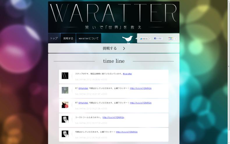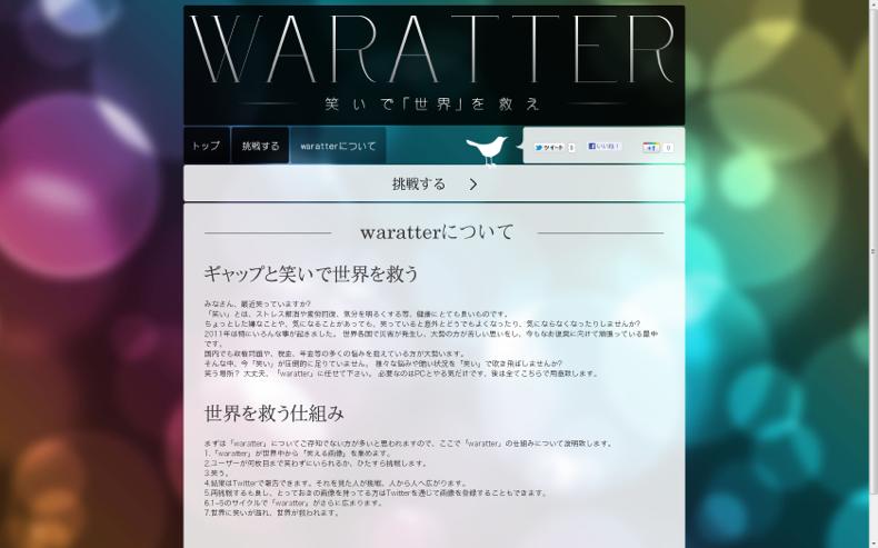 - 笑いで世界を救うがテーマのWebサービス。世界中から「笑える画像」をつめ、ユーザーが何枚目まで笑わずにいられるか、ひたすら挑戦。結果はtwitterで拡散し、人から人へ広がります。とっておきの画像はtwitterを通じて登録することができる。世界に笑いがあふれ、世界が救われる!