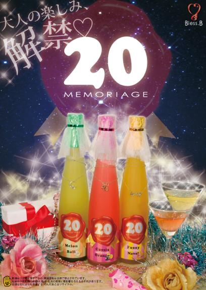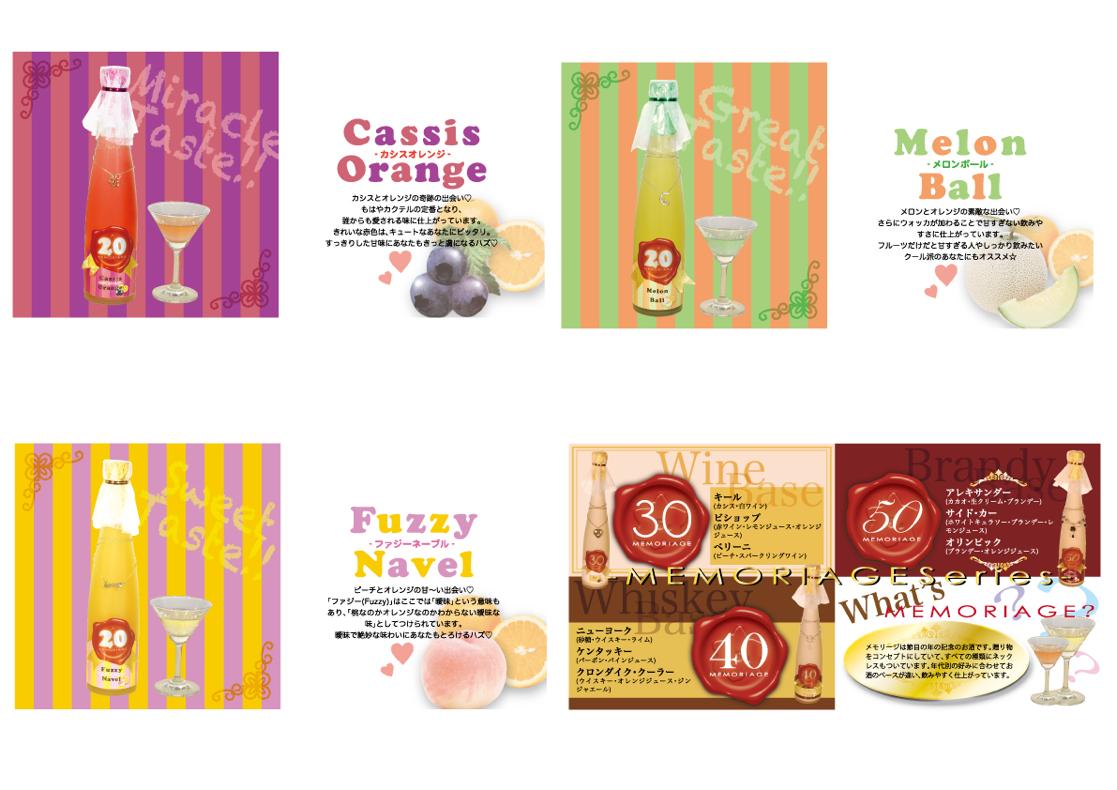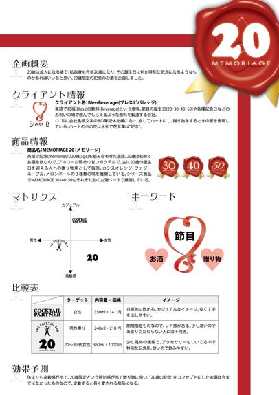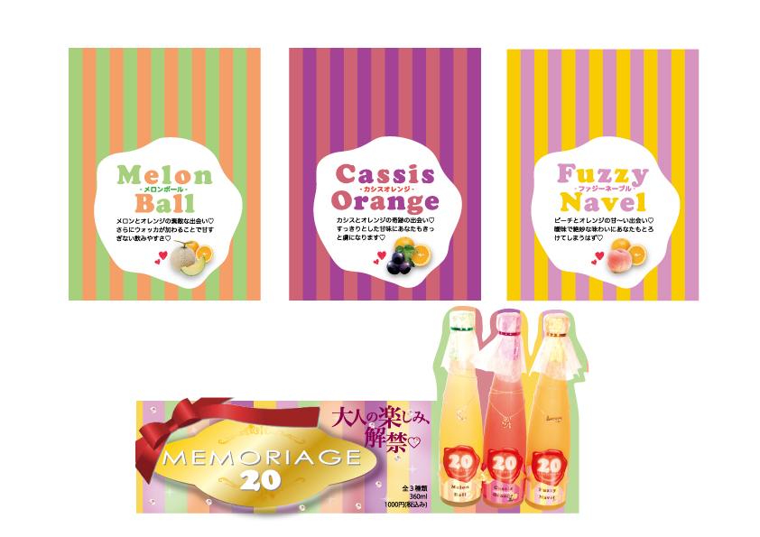 - 私自身も今年二十歳になり、その誕生日に何か特別な記念位なるようなものがあればいいなと思い、20歳限定の記念のお酒を企画。英語で記念(Memorial)の20歳(age)を組み合わせた造語。20歳は初めてお酒を飲むので、アルコールに弱めの甘いカクテルで、主に20歳の誕生日を迎える人への贈り物用として販売。“20歳の記念”をコンセプトにしたお酒は今までになかったものなので、定着すると長く愛される商品になる。