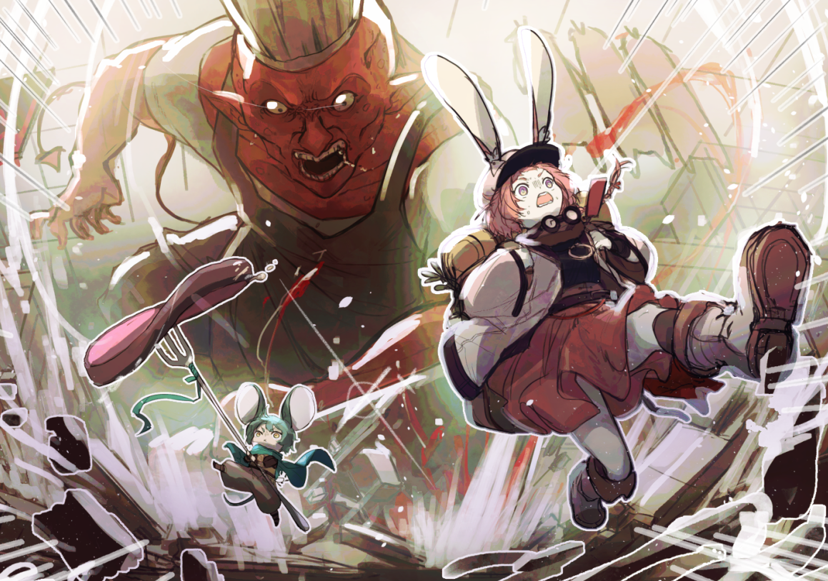 - 動きのある、物語の1シーンをイメージして、かわいいキャラクター、怖そうな敵が一緒にまとまっている絵にしたいと思い制作しました。