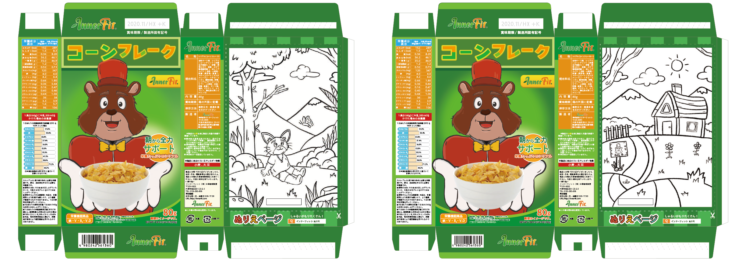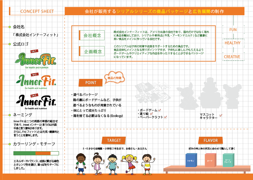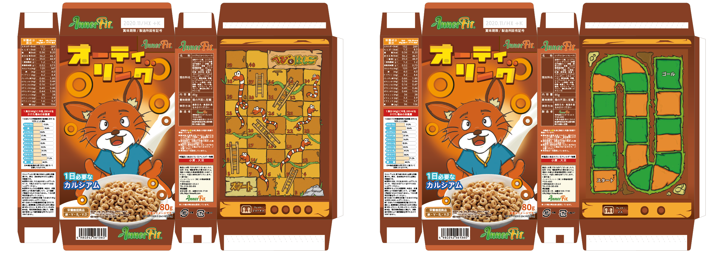 - テーマは、食品メーカーが作った子供向けの健康的なシリアル「インナーフィット」が、子供の成長や知育のサポートを伝えることです。子供に楽しんでもらえるよう、パッケージは遊べる箱になっています。作品のコンセプトやターゲットの設定がしっかりしている所がポイントです。設定したターゲットにマッチしたアプローチの仕方、デザイン、そしてサービスがこの作品の魅力です。