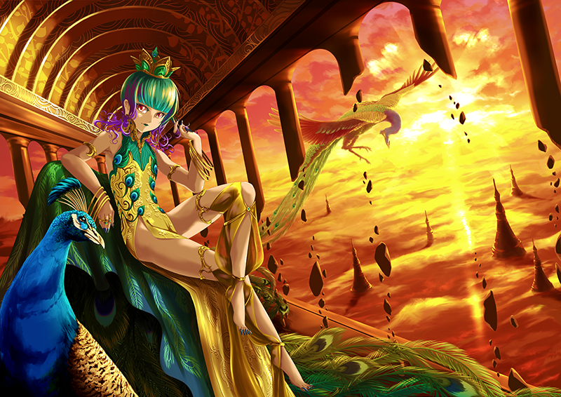 仏教美術インスピレーションイラストです。日本だけでなく、孔雀明王は私の母国(タイ)の宗教にも関係ありますから、タイ・インドの伝統的な美術(柄、建物)と混ざったデザインです。孔雀明王は菩薩の一人なんですが、基本的に菩薩の性別が中性的なので、このイラストのキャラクターにもそう描きました。夕日のイメージを使った理由は、「世紀の変わる」は現代が終わるという意味ので、昼間は終わる夕日を表現しています。
