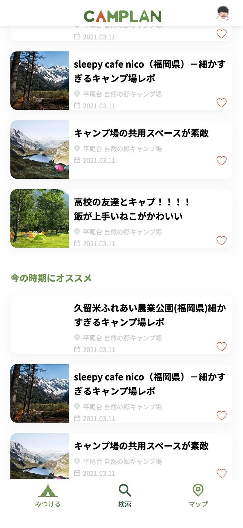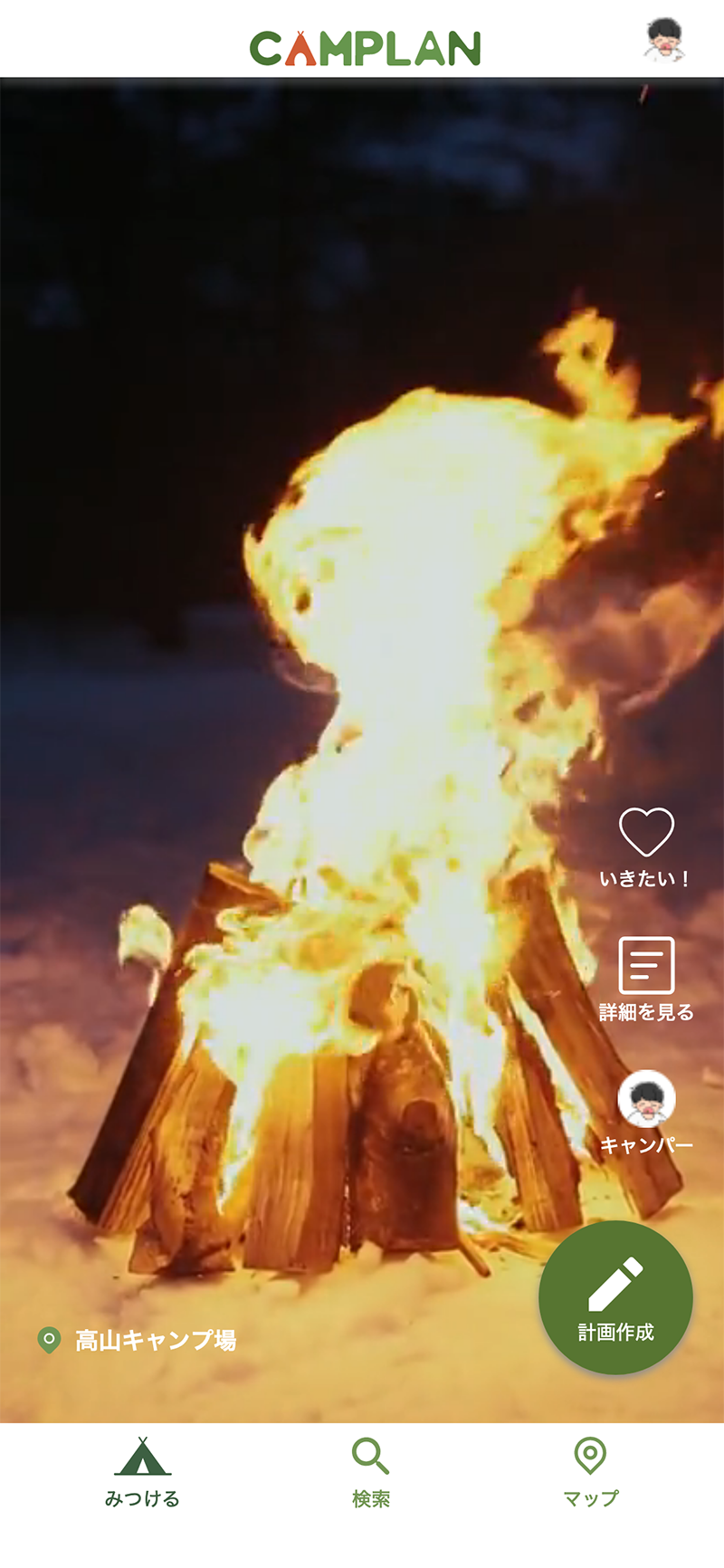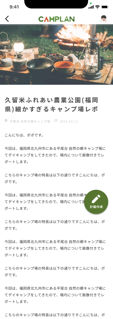 アニメ、インスタグラム、Youtube など様々な場所でキャンプの動画を見かけても、いざその理想のキャンプをしようと思ってもなかなかできないもの。その理想を実現させるために、オリジナルキャラクターキャンピーくんと共に場所選びから、荷物の準備まで一緒に計画を立てていくので、初心者でも安心!!みんなもCAMPLANを使って、キャンプに出かけよう!!