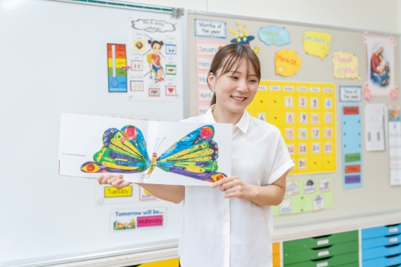 こども園の幼稚園教諭として年少クラスの担任を務めています。クラスでは月に1、2回ほど英語でのアクティビティを行いますが、その際にECC国際外語の授業で学んだ内容は非常に役立っています。「Classroom English」で学んだ教室で実際に使う英単語やフレーズは、折り紙の折り方を教えたり、給食で出る食材について話したりするときにフル活用。また「児童英語教授法」でクラスメイトや子どもたちの前で英語での模擬授業を行った経験も自信につながっています。また、クラスにはネイティブの子どももいるため英語で会話をしたり保護者対応を行ったりすることもしばしばです。学生時代にネイティブの先生方と英語でコミュニケーションするのが当たり前だったため、さほど身構えずにスムーズに対応することができています。