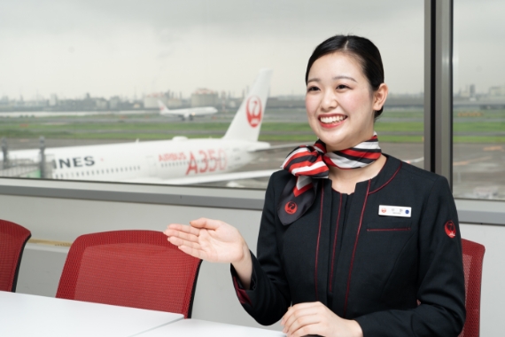 旅行や接客が好きな私にとって客室乗務員の仕事は憧れでしたが、自分には無理だとどこかで諦めていました。しかしECC国際外語のオープンキャンパスで心境が変化。充実したカリキュラム、英語を母国語とする多くの先生方による熱のこもった授業、先輩たちが生き生きと学ぶ姿に惹かれて「この学校で学びたい」と入学を決意。語学力や専門スキルを2年間で習得し、2020年9月に日本航空に入社しました。現在は国内線の客室乗務員を務めています。
