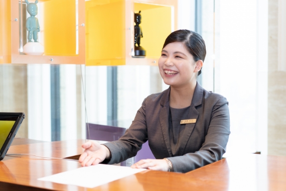 現在は「ゲストリレーション」として、コンシェルジュよりさらに幅広い業務を担当しています。この職種は、VIP対応を含めたロビーでのおもてなしをはじめ、他部門のヘルプを行うことも多く、オールラウンドのスキルが必要とされます。またレストランやハウスキーピングと連携して、お客さまに合わせたウェルカムアメニティの手配や記念日などのプロデュースも大切な業務の一つです。一度、プロポーズを検討されているお客さまを担当させていただき、レストランでのサプライズ計画、お部屋のデコレーション、花束の手配などをトータルでお手伝いしたことがあります。無事にプロポーズが成功し、半年後にご本人さまから温かいメッセージとプロポーズ記念の動画が届きました。誰かの人生の節目に関われたことが心から嬉しく、ホテルのゲストリレーションとして働いていることを誇らしく思えた出来事でした。