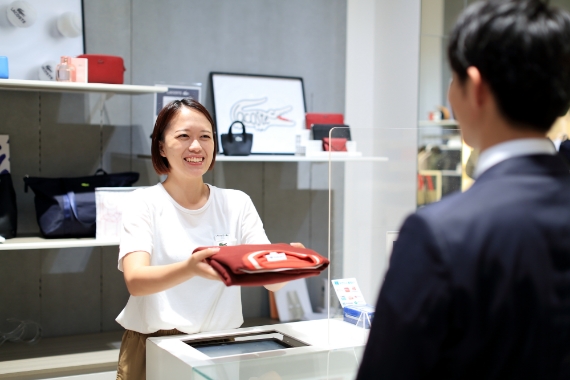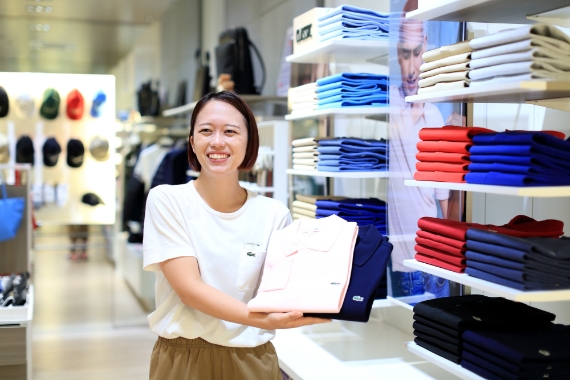 ラコステのららぽーとエキスポシティ店で販売員をしています。また今年から自分のコーディネートをHPで公開するコンテンツにも参加しているので、自店のお客様以外の方にも見ていただける分、スタイリングへの探求心も高まりますし、売上への貢献度も実感しやすくなったのでモチベーションが上がります。ラコステは海外のブランドなので日本とサイズ感が異なりますが、実際にご自身で購入されるお客様だけではなくプレゼント需要も多いため、よくお話を聞いた上で商品をおすすめするようにしています。先日、お父様へのプレゼントをお求めに来られたお客さまがいらっしゃいました。お父様の体格や色の好みなど、さまざまなことをお尋ねし、イメージを膨らませて提案した商品を大変気に入っていただけて、後日わざわざ再来店してまで報告いただいたときには感激しました。お客さまからの「ありがとう」は、私にとって最大のモチベーションアップになっています。海外からお越しのお客さまもいらっしゃるので、英語での接客は私が率先して対応するようにしています。普段から積極的に海外のお客様とコミュニケーションをとることに加え、英語のニュースや海外のYouTubeなどを見ることで、毎日英語に触れるように心がけています。