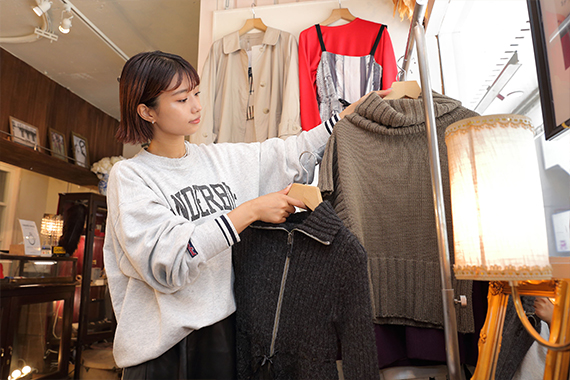 ハイブランドの古着を中心に扱うヴィンテージショップで店長をしています。全3店舗、スタッフは総勢15人ほどの小さな会社ですが、大手のアパレルショップとは違い、自分のやりたいことにチャレンジできる環境に大きな魅力を感じています。もともと大阪・心斎橋の本店でアルバイトとして2年間働いていましたが、正社員として採用していただいた2カ月後には新店舗の店長に任命されました。それが現在の梅田本店。起ち上げから関わってきたので、非常に愛着のある店舗です。また、英語力を見込まれ、海外の仕入れも担当しています。イタリア担当のバイヤーとして、年に2〜3回現地に赴き買い付けを行うほか、インターネットを通じて自分の気に入った商品を仕入れています。そのため店に並ぶのはいずれも思い入れのあるものばかり。商品知識はもとより、仕入れたときのエピソードなども語ることができるので、お客様とのコミュニケーションもはずみ、固定ファンも増えてきました。