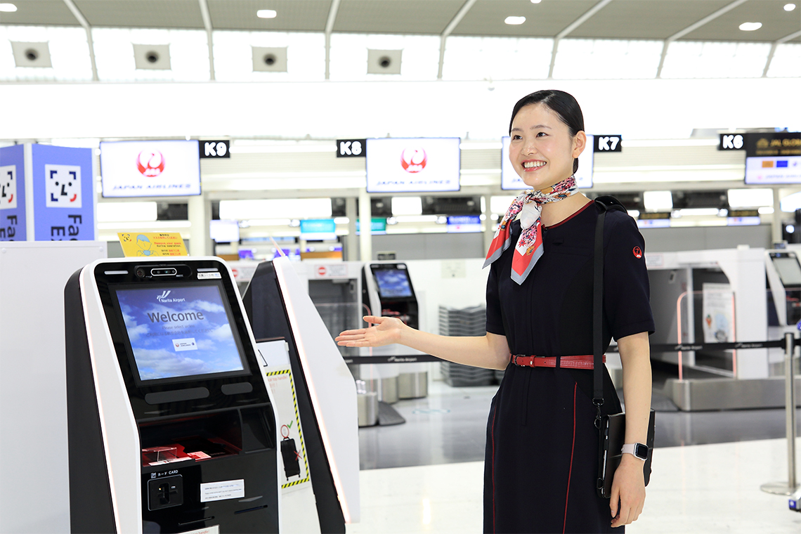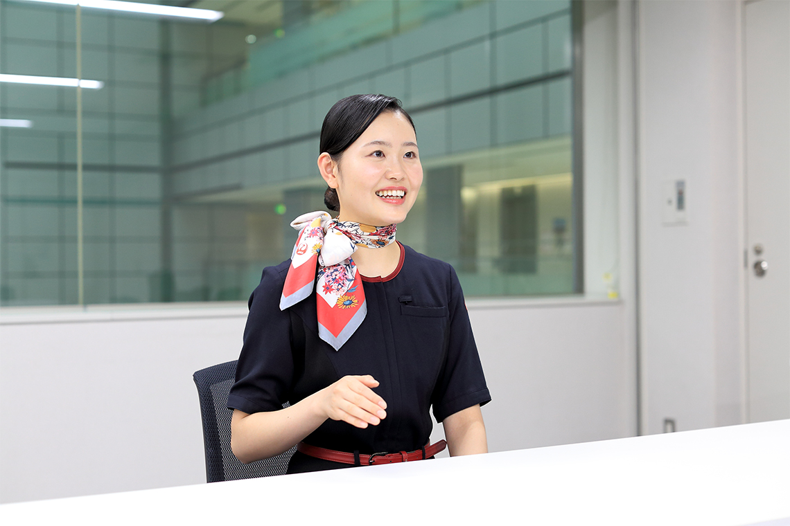 後輩への指導を通して、自分はリーダーとしての役割が得意であることに気づきました。それまで他人に指示するのは苦手だったので、自分の意外な一面を発見したと言えます。JALスカイには社員が登録するグループチャットがあり、先輩後輩関係なく、素晴らしい振る舞いや感謝の気持ちを伝える声がけが盛んです。私も後輩の業務で良いところを発見したら、チャットのメンバーに積極的に発信。誰かに褒められることは自信につながると思います。後輩が成長する姿をみて、将来は新入社員教育の教官になりたいという新たな目標もできました。特にグランドスタッフは海外のお客さまが最初に日本人と触れ合う場所。スタッフの対応次第で、日本の印象や再来訪が決まると言っても過言ではありません。私たちが優しく話しかけることで、お客さまに笑顔になってもらえる。そんなグランドスタッフをみんなで目指していきたいです。
