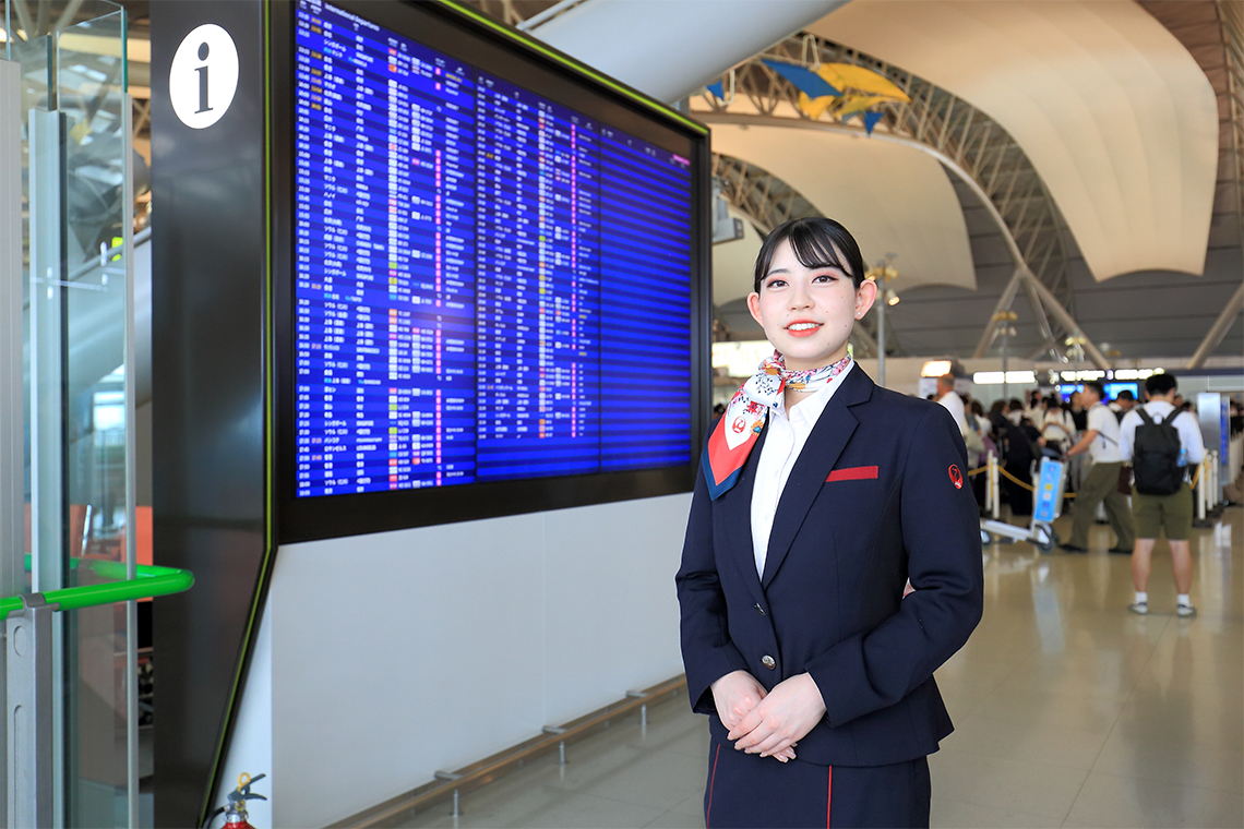 伊丹空港の近くに住んでいたので、飛行機を見るのも日常のひとコマ。幼い頃から空港は私にとって身近な存在でした。中学2年生の時、その伊丹空港で職場体験させてもらい目にとまったのが、グランドスタッフの接客。海外のお客さまに流ちょうな英語で話している姿が印象的でした。その後、英語教育に力を入れている高校へ進学し、高校卒業後にECC国際外語のエアラインコースに入学したのは、あの時に出会ったグランドスタッフのように英語を使って仕事をする人になるため。今はその夢を叶えることができ、関西国際空港でチェックイン、搭乗口、到着便のハンドリングに携わっています。お客さまの8割が海外の方。日本だけれど、まるで外国にいるかのような 特別な空間です。関西国際空港の雰囲気が大好きで、同期と食事をしたり、飛行機に乗って 旅行に出かけたり、仕事以外の時間も空港で過ごすほどお気に入りの場所です。
