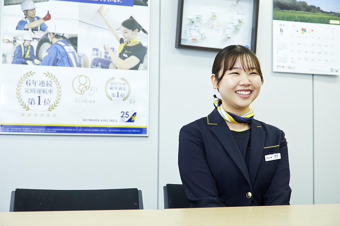 スカイマークで客室乗務員であるフライトアテンダントとして働いています。数ある航空会社の中からスカイマークに魅力を感じたのは、部署の垣根を越えた連携が素晴らしいところ。例えば客室の清掃。私たちだけでなく運航乗務員や整備担当者も掃除を手伝ってくれます。会社が時間通りのフライトに力をいれているので、チームで協力できると達成感を感じます。定刻通りの出発は、お客様にも喜んでいただき、お褒めの言葉をもらうこともあります。みんな仲がいいのもスカイマークの良いところですね。休みの日はヨガやピラティスを同僚と一緒に楽しんでリフレッシュをしています。