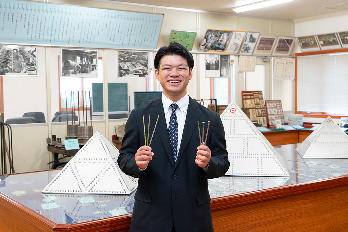 世界に販路を広げる釘のリーディングメーカー・日本製線。この春からその営業部で働き始めました。ここは学生時代に培った英語力を生かし、自分が中心となって働ける場所。北米に販路を広めるのが私のミッションです。今は仕事を覚えるために工場で研修も。受注、通関書類の作成、出荷までをひとりでこなせたときは達成感を得られますね。入社してから資材メーカーの世界を知ったので、自社製品の特徴を知れば知るほど魅力を感じています。例えば、コンクリート用の釘やヘッドがふたつある釘など。どれもホームセンターでは見かけない特殊なものばかり。仕事を始めてからは、建物を見ると、どんな釘が使われているか自然と目が行くようになりました。自社製品の良いところをアピールできるように、他社製品のリサーチが日課です。