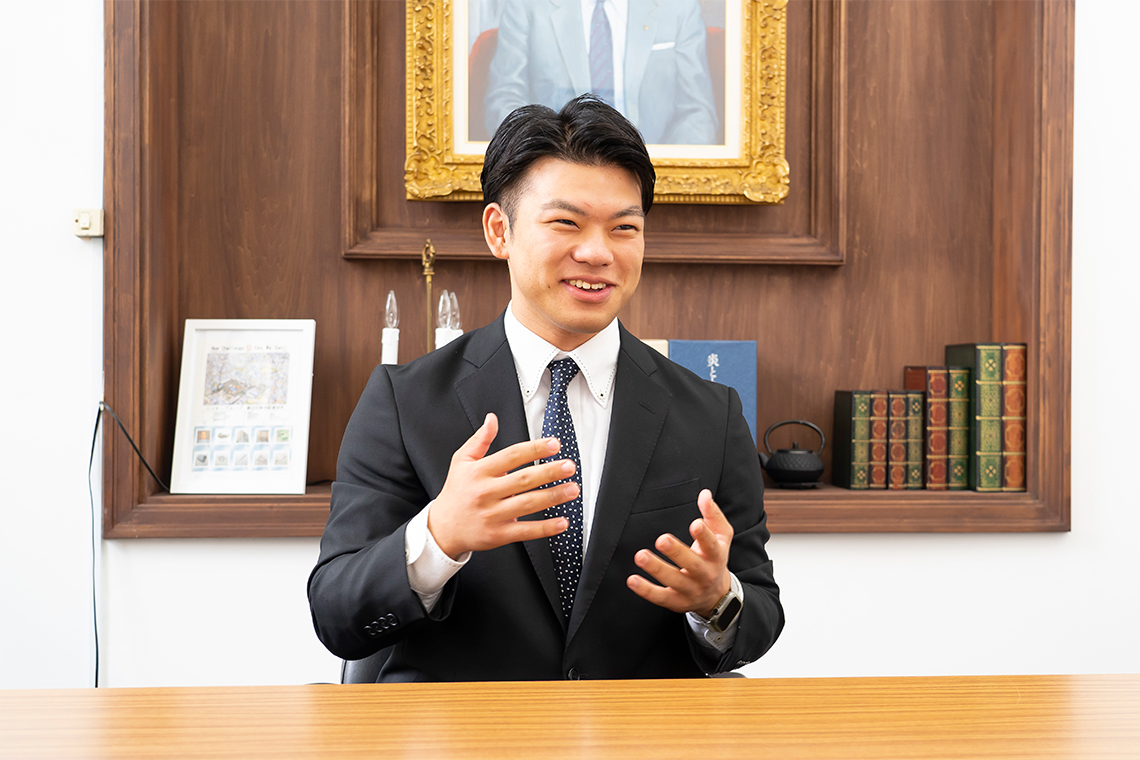今後はアメリカで開催される資材の展示会でのアテンドや商談といった仕事が待っていますが、気負いすぎてはいません。英語での商談資料の作成やプレゼンテーションも授業の延長線ととらえています。オープンキャンパスで在校生代表のスピーチを担当するなど、ECC国際外語では人前で発表することが多かったので。仕事上、海外のお客様と世間話をする機会もありますが、政治をトピックスにしたサイモン先生の授業のおかげで話のひきだしも豊富。政治について話すための英単語も頭に入っています。先日もタイから4名のお客様が来られた際に、タイの国王の話題になりましたが、会話に入っていくことができました。ECC国際外語では単に英語力をあげるだけでなく、ビジネスで役立つフレーズや話題をインプットしてもらえたことが仕事に生きています。