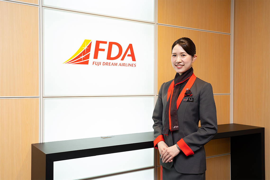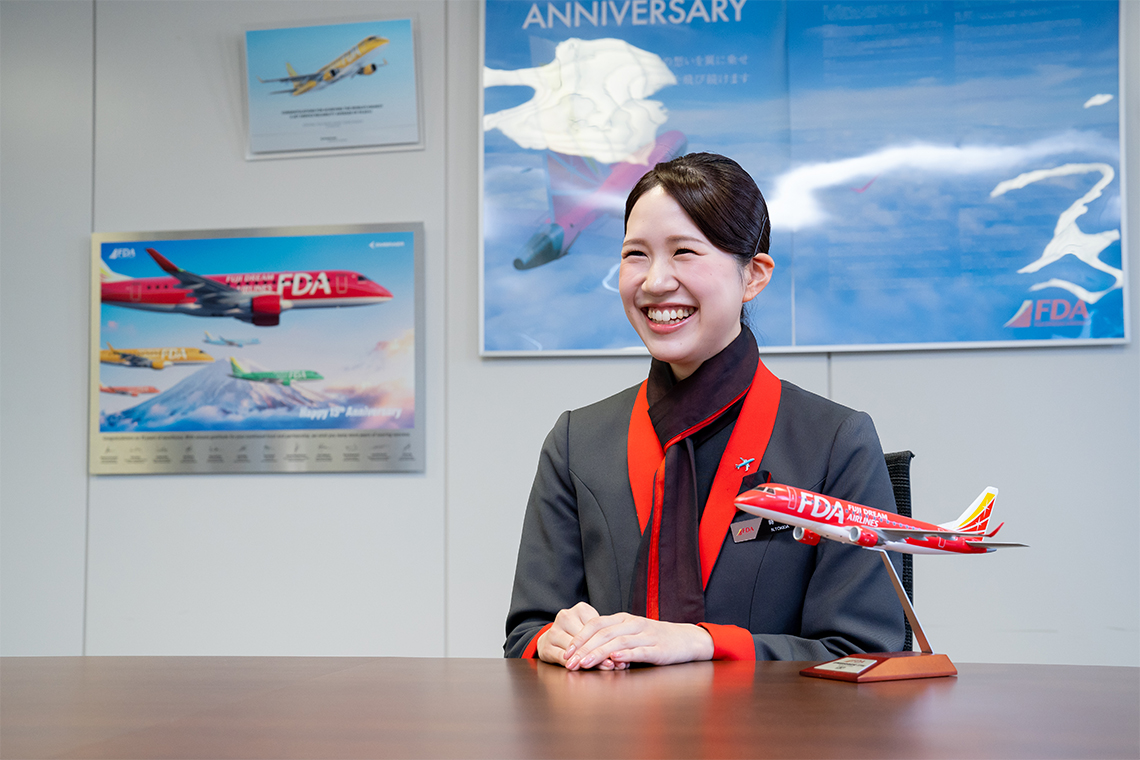 現在、私はフジドリームエアラインズ(FDA)で客室乗務員として勤務しています。定期便やチャーター便に乗務し、安全管理やサービスを担当するほか、OJTトレーナーやユニットリーダーとして後輩の育成にも携わっています。中学生の修学旅行の際に、初めて飛行機に乗り、客室乗務員の方々の細やかなサービスや落ち着いた応対を受け「人を笑顔にできる仕事って素敵だな」と感じたことが、この道を志した原点です。仕事のやりがいは、お客様が搭乗時よりも明るい表情で降機される瞬間。特に印象に残っているのは、遊覧飛行で出会った姉妹のお客様。妹さんの座席から富士山が見えず涙を流していたのですが、「次のタイミングで見えるよ」と声をかけると、実際に見えた瞬間に笑顔を見せてくれました。後日、お母様から「娘がCAになりたいと、英語の勉強を始めました」とのお手紙をいただき、自分の応対が誰かの未来につながることを実感し、かつて憧れた客室乗務員として働けていることに、改めて感慨深さを覚えました。
