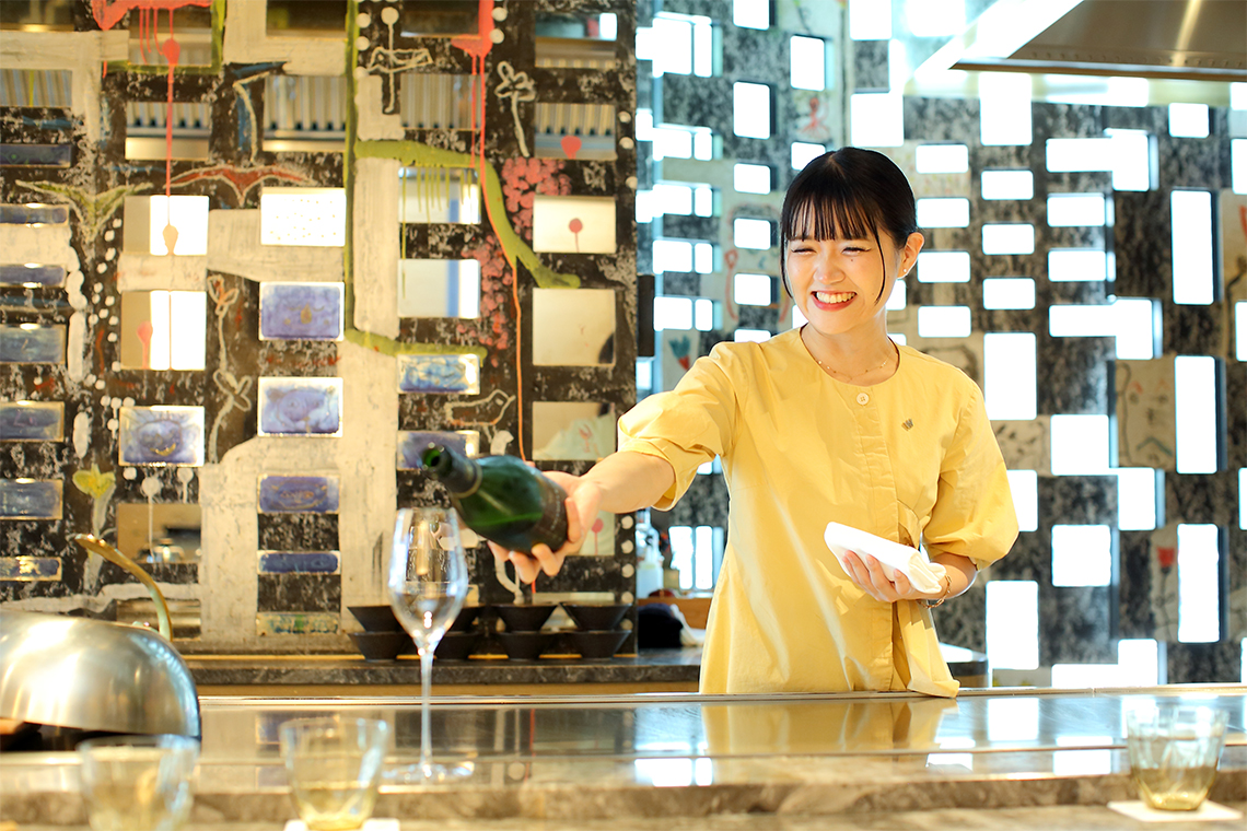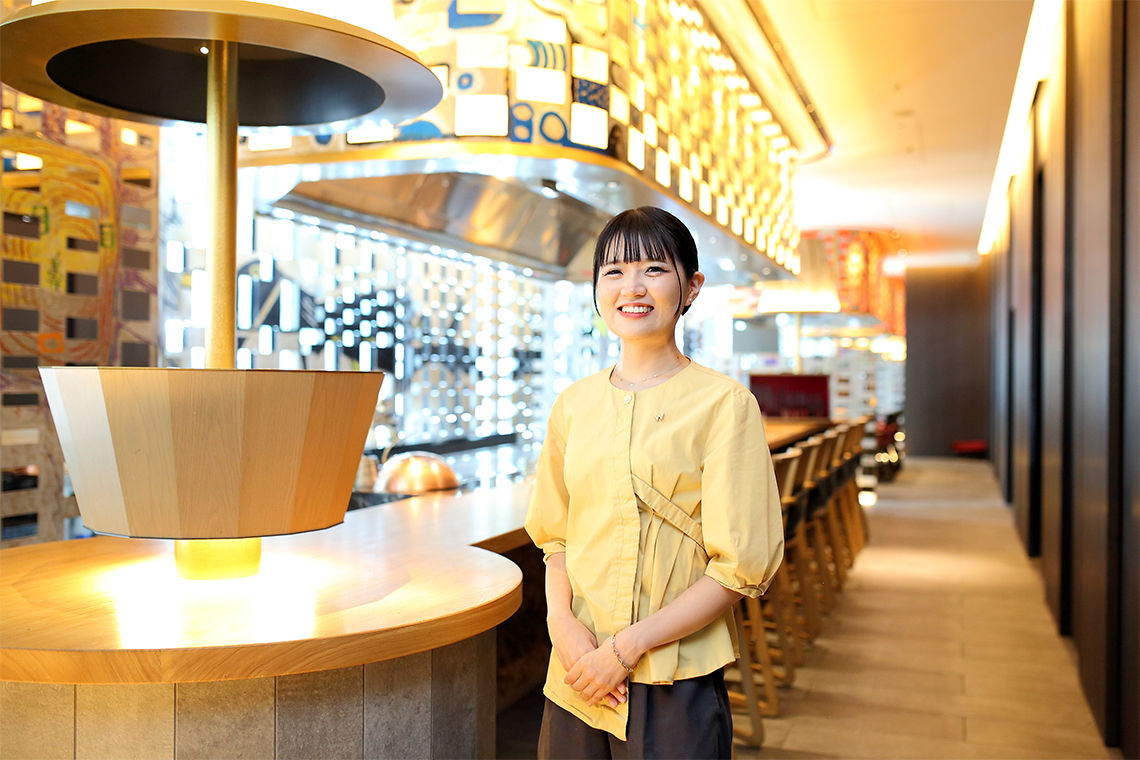 私は現在、W大阪でレストランサービスを担当しています。ホテル業界を目指したきっかけは、小学生の頃に見たドラマで「コンシェルジュ」という職業を知り、人を喜ばせる仕事に強く惹かれたことでした。当初はアメリカ留学も考えましたが、ホテルの現場で学びたいという思いや人間力を重視している点に魅力を感じて、ECC国際外語へ進学。コンシェルジュになるには館内全体を知る必要があったので、部門へのこだわりは持たず入社しました。現在は鉄板焼きレストランを中心に、接客・予約管理・スタッフ教育など幅広い業務を担当しています。また、トラブルが起きた際には、他の部署とも連携しながらどうすればお客様に楽しんでいただけるかを考え、チームで解決に取り組む場面もあります。そうした瞬間に、ホテル全体でお客様を支えている実感があり、この仕事の奥深さと面白さを日々感じています。特にお客様との何気ない会話から距離が縮まり、名前を覚えていただき、口コミに自分の名前を書いてもらえた時は、大きなやりがいを感じました。