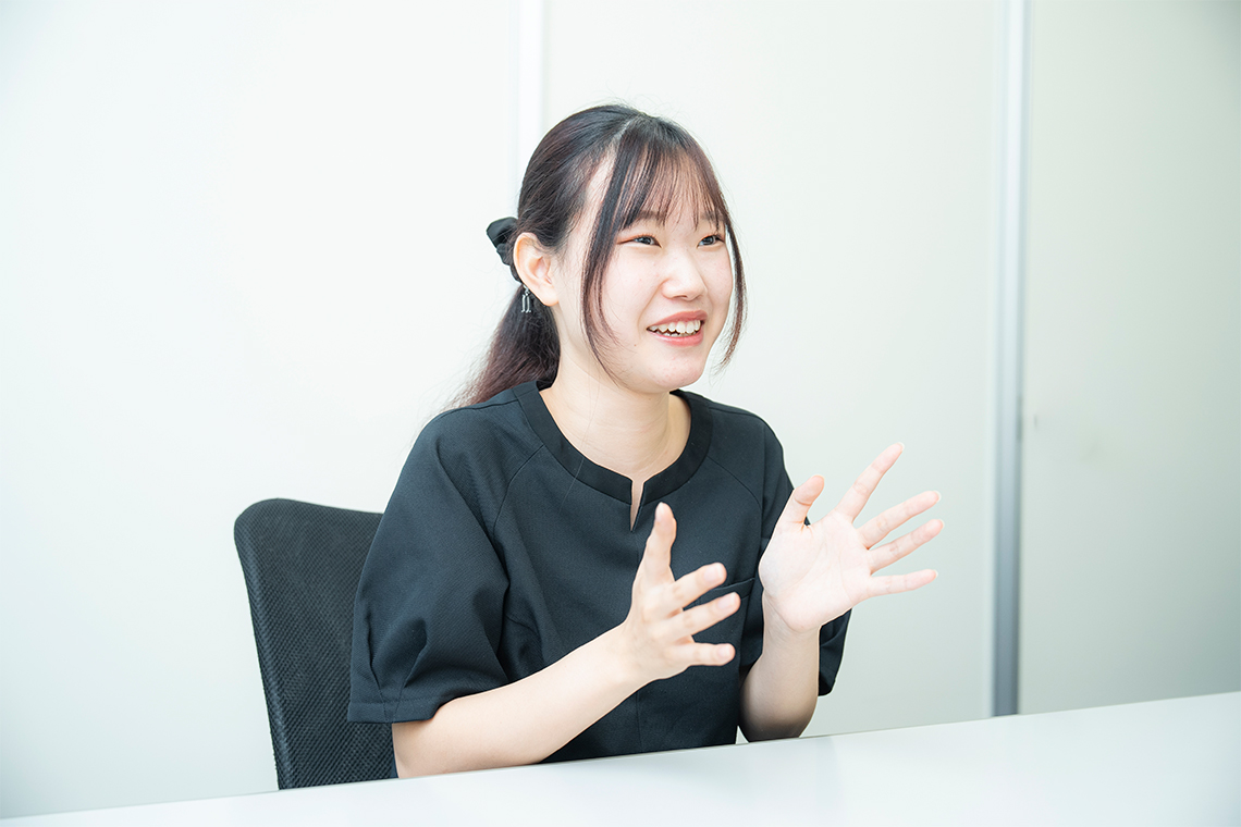 卒業してみると、ECC国際外語での2年間はとても短く感じました。勉強が伸び悩んだ時期もありましたが、同じ目標を持った同級生に支えられました。友達との日常会話やLINEのやりとりを韓国語にして楽しく乗り越えられたと思います。就職活動もキャリアセンターの先生のサポートで良い面接対策ができました。私が伝えたいことをまとめて整理してくださったことに感謝しています。こういった素敵な友達と先生に囲まれて、私は自分と他人を観察する目を養うことができました。自分に足りないところを探し、人を見て良いところをマネするようになったのです。就職後は実際に韓国語を使う機会が多いのですが、ここでも先輩や上司が使う言葉やフレーズをマネして韓国語力を上げています。だから今、語学に自信がなく、学校選びに迷っている高校生の皆さんも心配しないで、勇気を出してやりたいことに挑戦してほしいです。