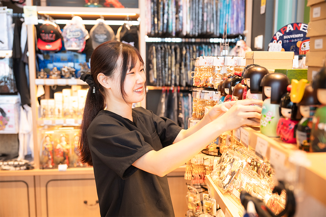 中学生の頃からK-POPの影響で韓国に興味があり、高校生になると空港の免税店で韓国語を使って働きたいという夢が芽生えました。韓国語の勉強はECC国際外語に入ってから始めましたが、2年間の学校生活を経て日常会話ができるレベルに成長。語学は毎日勉強しないと忘れてしまいます。希望通り関西国際空港の免税店に就職し、毎日、韓国語を使うことで会話力をキープできています。私の主な仕事は接客で、先日は韓国人ご夫婦のお土産選びをお手伝いしました。富士山や大阪城のマグネットをおすすめしたら喜んでいただけてうれしかったです。また、店内ディスプレイの変えたことで、手ぬぐいの売り上げを大きく伸ばすことができました。自分の工夫が成果につながる経験は、大きなやりがいとなっています。母から「行動力がついたね」と言われますが、自分で考えて行動できるようになったことが学生生活で一番成長できたことだと思います。