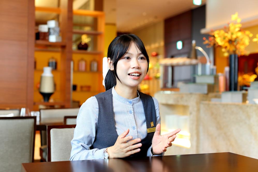 現在は主にレストランでの接客サービスを担当し、お客様に心地よい時間を過ごしていただけるよう取り組んでいます。同じ ECC国際外語出身の先輩も同じ職場におり、困ったときにはいつでも相談できる心強い存在です。仕事では日本語だけでなく、英語・中国語・ベトナム語を使う場面もあります。ある日、朝食のドリンクを提供した際、お子様がコーヒーや紅茶を飲めない様子に気づき、「お子様でも飲みやすいドリンクをいかがですか」と提案しました。実はそのご家族も私と同じベトナム出身で、とても喜んでいただき、私自身も心からうれしくなりました。新しく覚えることが多く、大変だと感じる瞬間もあります。それでも、「一度教えていただいたことは、次から自分一人でできるよう工夫する」という意識を持って続けた結果、今ではその考え方が習慣になっています。もし間違いがあっても、上司や先輩が改善の方法まで一緒に考えてくださるので、安心して挑戦し続けられています。
